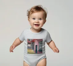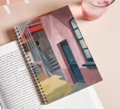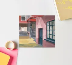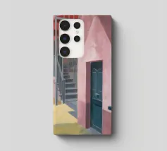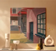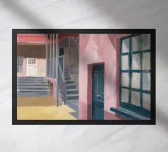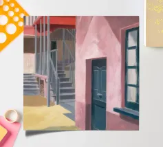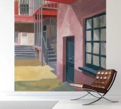 Eine komplexe urbane Szene wird mit dem Schwerpunkt auf geometrischen Formen und einer kräftigen Farbpalette aus Pink, Teal und Rot wiedergegeben. Eine Außentreppe bildet ein starkes kompositorisches Element, das den Blick durch die abstrakten architektonischen Formen führt.