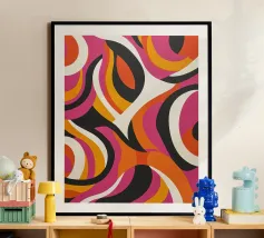 Ein gewagtes abstraktes Muster mit einem Hauch von dynamischer Energie, das Bewegung und Fließen symbolisiert. Kräftige Farben, die Themen wie Wasser, Leben und Bewegung hervorrufen. Eine innovative Verschmelzung von Tradition und Moderne für zeitgemäße, minimalistische Innenräume. eine einzigartige visuelle Sprache, die kulturelle Grenzen überwindet.