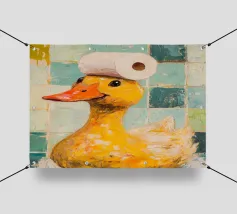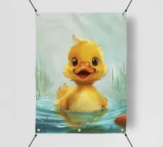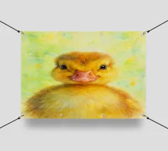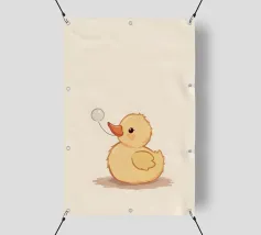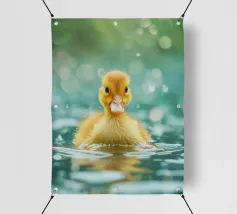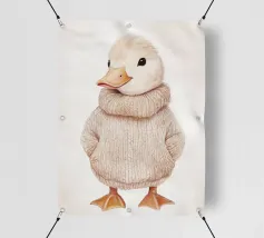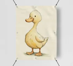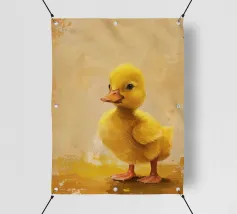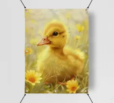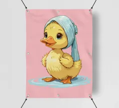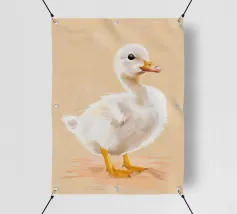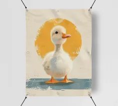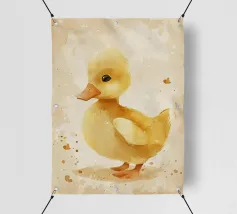 Ein niedliches Entenküken lugt unter einem weichen weißen Handtuch hervor. Seine flauschigen gelben Federn und seine neugierigen Augen schaffen eine bezaubernde und charmante Szene.