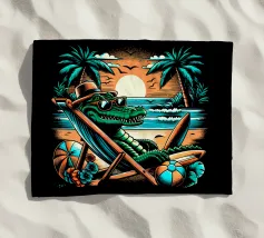 Ein entspanntes Wasserschwein mit Sonnenbrille faulenzt an einem Strand mit einem tropischen Getränk und einem farbenfrohen Sonnenuntergang im Hintergrund. Der Schriftzug "Chill Vibes Only" ist neben dem Wasserschwein gut sichtbar angebracht.