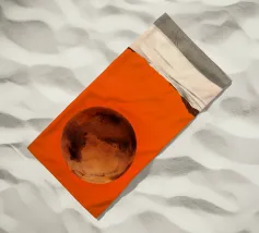 Diese digitale Illustration zeigt den waghalsigen Absprung von zwei mutigen Fallschirmspringern über einer fremden roten Wüstenlandschaft. Das Terrain unter ihnen ist eine riesige, karge Fläche aus purpurroten Sanddünen.