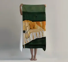 Ein heiteres und skurriles Kunstwerk, das einen Geparden zeigt, der friedlich auf einem grün-weiß gestreiften Sofa schläft. Die kühnen Muster und die gemütliche Haltung der Großkatze schaffen einen verträumten, humorvollen Kontrast zwischen wilder Natur und entspanntem häuslichem Leben. Perfekt für Tierliebhaber, eklektische Kunstsammler und Fans einer verspielten Innenraumästhetik.