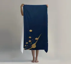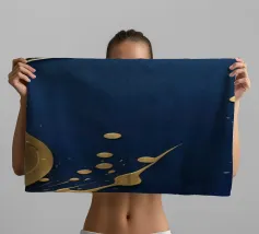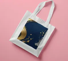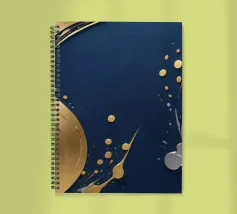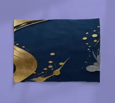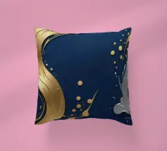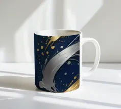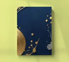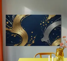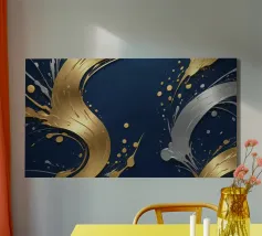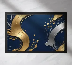 Dieser elegante, abstrakte Hintergrund zeigt fließende Gold- und Silberelemente mit kreisförmigen Akzenten auf einer sattblauen Leinwand und sorgt so für eine beeindruckende visuelle Wirkung, die sich für kreative Projekte eignet.
