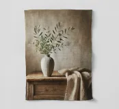 Ein rustikales Stillleben mit einem Holztisch und einer schlichten Vase mit Olivenzweigen, die in sanftes natürliches Licht getaucht ist und mediterranen Charme und zeitlose Eleganz versprüht.
