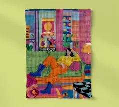 Eine Innenraumszene mit einer schwarzen Katze, die in einem gemütlichen Zimmer mit einer rosafarbenen Flamingostatue sitzt, und einer Frau, die in einem Sessel liest. Die Komposition ist eklektisch, stilvoll und ein charmanter Schnappschuss eines Hauses voller Persönlichkeit.