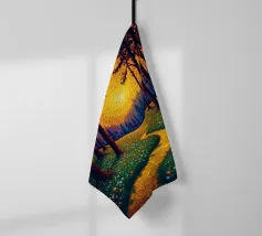 Treten Sie mit diesem fesselnden Gemälde in eine Welt aus leuchtenden Farben und ruhigem Licht ein. Das Gemälde zeigt einen magischen Waldweg, der sich zu einer leuchtenden Lichtung schlängelt. Hoch aufragende, uralte Bäume mit tiefblauem und grünem Laub bilden einen natürlichen Torbogen, der den Blick des Betrachters lenkt. Der sonnenüberflutete Pfad ist von zarten Wildblumen gesäumt, die das üppige, grüne Unterholz mit rosa und violetten Farbtupfern bereichern. Das ätherische Leuchten am Ende des Weges lässt den Betrachter tiefer in diese verzauberte Szene eintauchen und verspricht ein Gefühl der Hoffnung, des Staunens und der Ruhe. Dieses Kunstwerk ist perfekt, um eine t