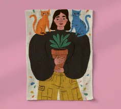 Eine Illustration einer Frau in einem leuchtenden, orangefarbenen Tupfenkleid, die auf einem Sofa liegend ein Buch liest. Eine kleine schwarze Katze läuft vorbei und unterstreicht die gemütliche und zufriedene häusliche Szene.