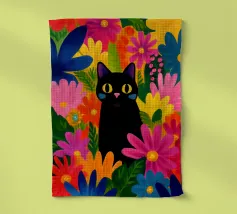 Ein wunderschönes Porträt einer schwarz-weiß getigerten Katze mit intensiven Augen, eingerahmt von leuchtend roten Tulpen. Das Kunstwerk ist eine eindrucksvolle und elegante Hommage an ein geliebtes Haustier.