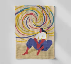 Eine abstrakte Landschaft wird in geometrische Formen und kräftige Farben zerlegt und zeigt eine Sonne, Hügel und Laub in einer fragmentierten und doch harmonischen Komposition vor einem dunklen Hintergrund.
