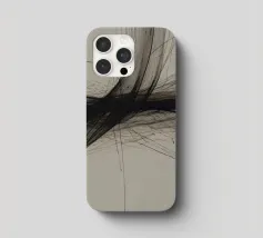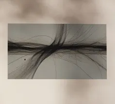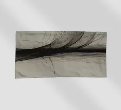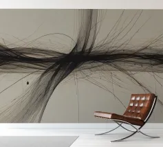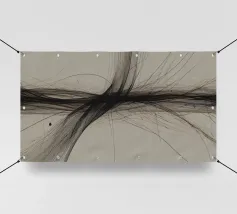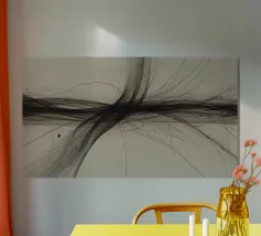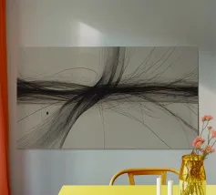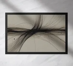 Das Kunstwerk zeigt eine dynamische Komposition aus schwarzen Linien, die sich auf einem hellen Hintergrund kreuzen und ein faszinierendes abstraktes Muster bilden, das die Aufmerksamkeit auf sich zieht.