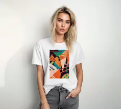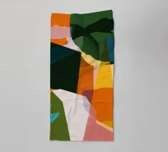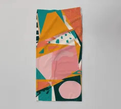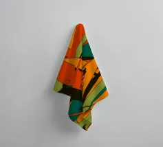 Eine energiegeladene abstrakte Komposition, in der kühne geometrische Formen, Linien und Muster in Orange, Grüntönen und Schwarz aufeinandertreffen und sich überlagern, so dass ein Gefühl von dynamischer Bewegung entsteht.