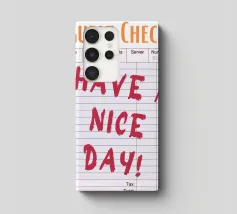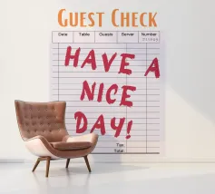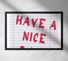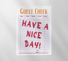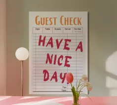 Bringen Sie einen Hauch von nostalgischem Charme und Positivität in Ihren Raum mit diesem einzigartigen digitalen Poster, das wie eine klassische Restaurantrechnung gestaltet ist. Oben steht "GUEST CHECK" in einer warmen, orangefarbenen Schrift mit Tischdetails, während der Hauptteil des Schecks mit der fetten, roten, handgeschriebenen Botschaft durchgestrichen ist: "HAVE A NICE DAY!" Die Vintage-inspirierten Linien und Details des Schecks bilden einen schönen Kontrast zu der lebendigen, ermutigenden Botschaft. Dieses hochwertige Digitalposter mit einer Auflösung von 7000x5000 Pixeln und 300 dpi bringt die Exzellenz zeitgenössischer Pop-Art und eine fröhliche Stimmung in dein Zuhause.