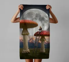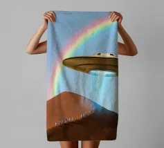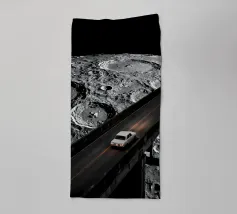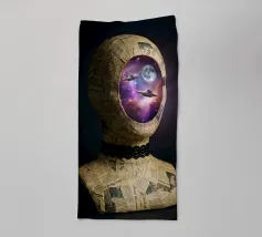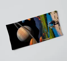 Dieses surreale Kunstwerk verbindet einen sonnenbeschienenen tropischen Strand mit einer atemberaubenden kosmischen Wendung, die einen massiven Planeten zeigt, der sich über dramatische Wüstenklippen erhebt. Ein Vintage-inspiriertes Paar steht am Ufer und blickt auf einen unmöglichen, aber traumhaften Horizont, an dem Meer, Land und Raum aufeinandertreffen. Der Kontrast von warmem Sand, türkisfarbenem Wasser und himmlischen Blautönen schafft ein beeindruckendes visuelles Gleichgewicht, das Staunen, Romantik und Eskapismus hervorruft. Dieses Wandbild eignet sich perfekt für moderne Innenräume, Kreativstudios oder Reiseliebhaber und spricht Fans von surrealen Landschaften, Retro-Ästhetik und Fantasy-Kunst an.
