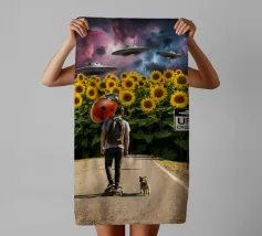 Dieses fantasievolle Kunstwerk verbindet Science-Fiction-Wunder mit natürlicher Schönheit. Zwei Wanderer stehen in einem üppigen Wald und starren auf die Erde, die sich unvorstellbar nah am Himmel abzeichnet, während UFOs über ihnen schweben und helle Lichtstrahlen werfen. Ein plakatives Warnschild "Descent Zone" verleiht der surrealen Szene Humor und Abenteuer. Reichhaltige Details, kosmische Elemente und eine filmische Atmosphäre machen dieses Werk perfekt für Fans außerirdischer Kunst, Fantasielandschaften und einzigartiger Wanddekoration, die Neugierde und Gespräche anregt.