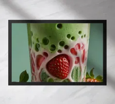 Ein erfrischender, minzgrüner Smoothie mit frischen Erdbeeren, serviert in einem eleganten Glas, ist ein köstlicher und lebendiger Sommergenuss.