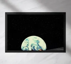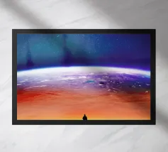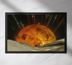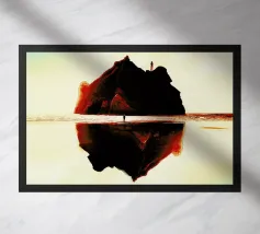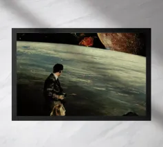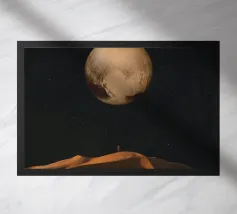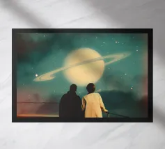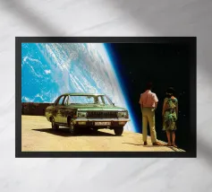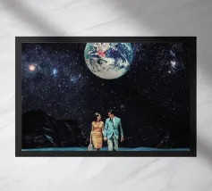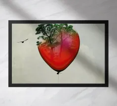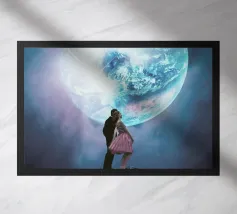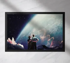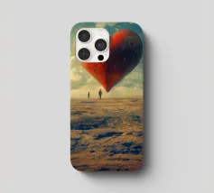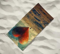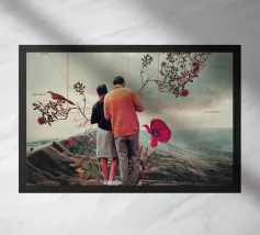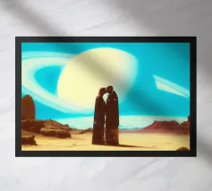 Ein kolossales, verwittertes Herz schwebt gelassen über einer weiten, zerklüfteten Landschaft, ein kraftvolles Symbol für dauerhafte Liebe in einer trostlosen Welt. Zwei kleine Figuren stehen in seiner Gegenwart und verstärken das epische Ausmaß und das filmische Gefühl dieses surrealen Kunstwerks. Mit seinen Vintage-Tönen und seiner zum Nachdenken anregenden Bildsprache ist dieses Werk ein Gesprächsanlass und eine Hommage an die große Reise der Liebe.