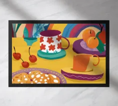 Eine abstrakte Komposition zeigt eine Schale mit Erdbeeren inmitten eines Wirbels aus bunten, organischen Formen und Mustern, die eine frische und moderne Interpretation eines Sommerklassikers darstellen.