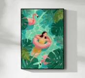 Das Sonnenlicht tanzt auf kräuselndem Türkis, während sie in der Stille schwebt, umhüllt von einem rosa Ring und der Ruhe eines perfekten Tages. Flamingos treiben in der Nähe wie sanfte Gedanken, und die Welt über ihr verschwindet in der Stille - warm, schwerelos und wunderbar weit weg.