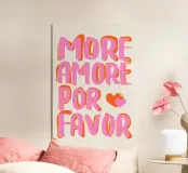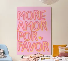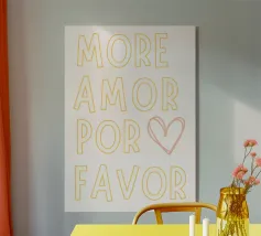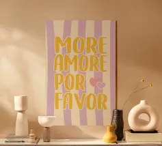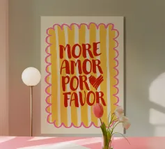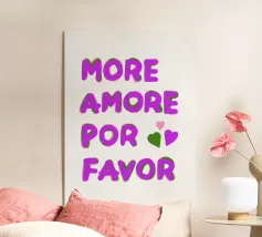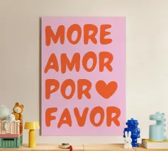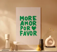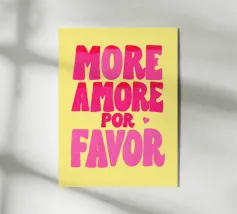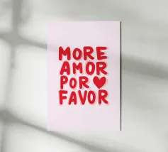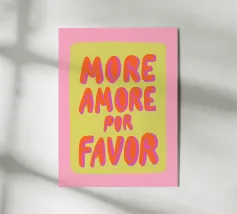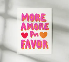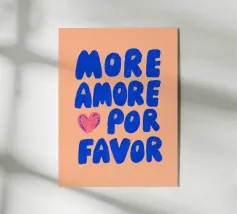 Das Bild ist ein lebhaftes Poster mit einem verspielten, künstlerischen Design. Der Hintergrund ist hellbeige, und der Text ist in großen, fetten Buchstaben in Rosa- und Rot-Orange-Tönen geschrieben. Die Botschaft lautet: „MORE AMORE POR FAVOR“, was auf Englisch so viel heißt wie ‚Mehr Liebe, bitte‘. Die Worte sind in drei Zeilen angeordnet, und rechts von der untersten Zeile befinden sich zwei Herzen, eines in Rot-Orange, das andere in Rosa, die sich leicht überlappen. Der Gesamtstil ist fröhlich und einladend und vermittelt eine Botschaft der Liebe und Positivität.