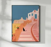 Eine bezaubernde Illustration einer schwarzen Katze, die auf den Stufen einer schönen Stadt am Meer sitzt, deren Gebäude in zarten Rosatönen gehalten sind. Die Szene ist friedlich, malerisch und voller mediterranem Charme.