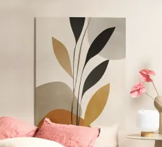 Eine zarte Komposition aus Eukalyptusblättern in weichen, durchscheinenden Erdtönen. Dieses abstrakte, minimalistische botanische Kunstwerk vermittelt ein Gefühl von Ruhe und Achtsamkeit und eignet sich perfekt für moderne, von Wellness inspirierte Innenräume.