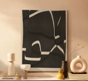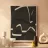 Eine abstrakte Komposition mit sich überschneidenden schwarzen Kurven und Linien auf beigem Hintergrund. Das Design spielt mit Kontrasten und geometrischen Formen, um ein Gleichgewicht zwischen Bewegung und Stille zu schaffen.