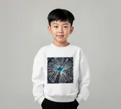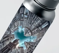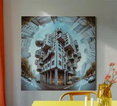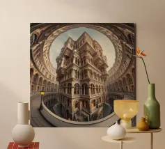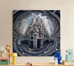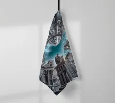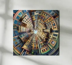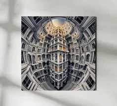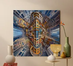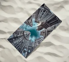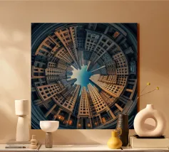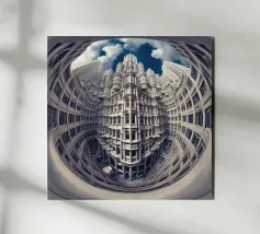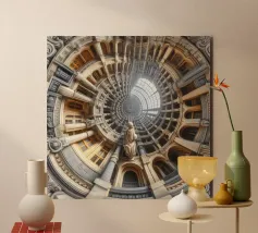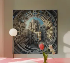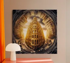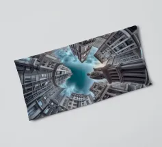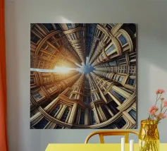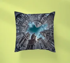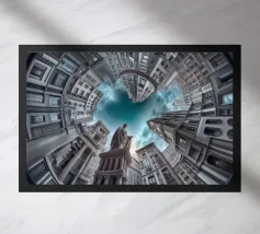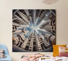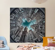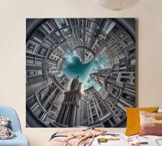 Dieses Bild zeigt eine beeindruckende kreisförmige architektonische Anordnung mit hohen, modernisierten klassischen Gebäuden, die zum Himmel hin konvergieren. Eine prominente Statue in der Mitte verstärkt die dramatische Perspektive unter einem wolkenverhangenen blauen Himmel.
