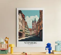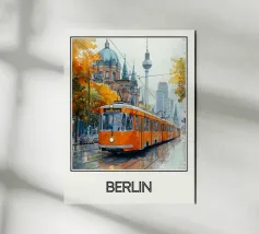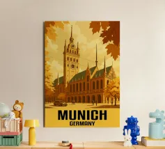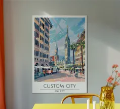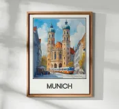 Affiche artistique illustrant la majestueuse cathédrale Frauenkirche de Munich avec un tramway passant devant et une scène animée de la ville. Parfaite pour ajouter une touche culturelle et dynamique à votre décoration intérieure.