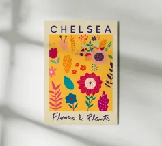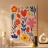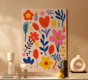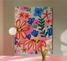 Eine bunte Mischung aus Blumen und Blättern bildet ein lebendiges, farbenfrohes Muster vor einem hellen Hintergrund. Kräftige Farben wie Rot, Blau und Gelb unterstreichen die spielerische und fröhliche Stimmung.