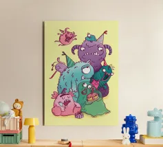Eine lustige Gruppe von Monstern im nächtlichen Wald, umgeben von Blumen, Pilzen und magischem Licht. Dieses Design ist verspielt, kreativ und perfekt für alle Monster- und Fantasie-Fans.