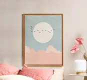 Eine zarte Illustration Malerei zeigt sanfte, rosa Berge und einen runde Sone am hellblauen Himmel. Vögel fliegen elegant über den Horizont, während die minimalistische Komposition die Schönheit der Natur und Astronomie verbindet. Diese harmonische Darstellung bringt Ruhe und Träume in jede Inneneinrichtung.
