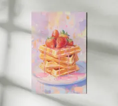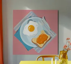 Ein Stapel von drei Toastbrotscheiben mit einer großzügigen Schicht leuchtend roter Marmelade auf der Oberseite befindet sich vor einem rosa und weiß karierten Hintergrund. Die realistische Darstellung des Brotes kontrastiert mit dem verspielten, geometrischen Hintergrund.