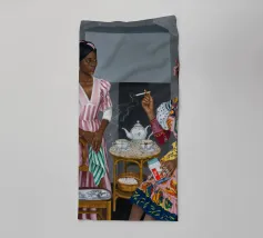 Dieses Kunstwerk zeigt eine Person, die auf einem gestreiften Stuhl sitzt, umgeben von Sonnenblumen und einer grünen Tasche. Der Hintergrund ist ein gedämpftes Braun, das eine rustikale und nachdenkliche Atmosphäre schafft.