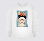 Digitales Porträt Malerei von Frida Kahlo im Boho-Stil begeistert mit floralen pastel Elementen und leuchtenden Farben wie hellblau, Rosa und Gelb, die ihre ikonischen Merkmale wunderbar zur Geltung bringen. Perfekt für moderne Inneneinrichtungen oder Kinderzimmer, verkörpert es die Schönheit der Modernen Graphic Kunst und inspiriert zugleich.
