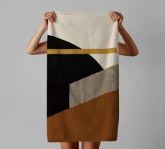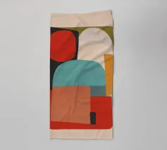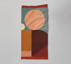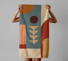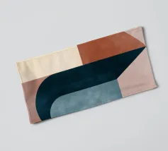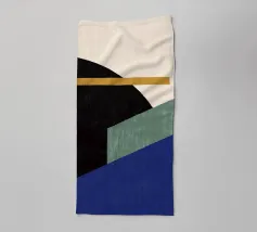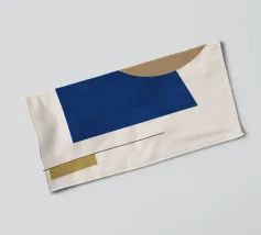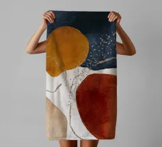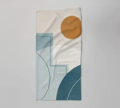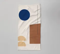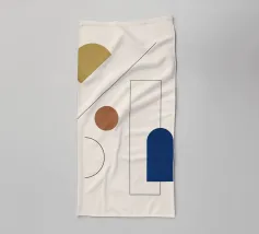 Geometrische Formen und Erdtöne schaffen ein modernes Design mit abstrakten Linien und Formen. Die Komposition umfasst sich überschneidende Rechtecke und einen Halbkreis, die durch goldene Akzente hervorgehoben werden.