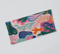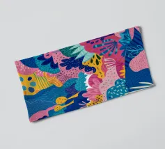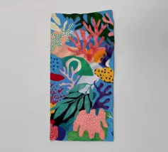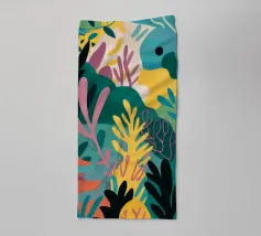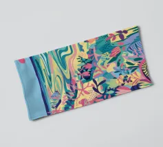 Eine abstrakte, lebendige Küstenlandschaft, in der das Meer ein Strudel aus blauen, rosafarbenen und orangefarbenen Wellen ist, die gegen eine Küste voller stilisierter, bunter Blätter schlagen.