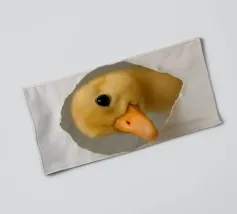 Ein niedliches Entenküken lugt unter einem weichen weißen Handtuch hervor. Seine flauschigen gelben Federn und seine neugierigen Augen schaffen eine bezaubernde und charmante Szene.