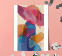 Eine abstrakte Komposition aus fließenden, sich überlagernden, durchscheinenden Formen in warmen Rosa-, Orange- und Beigetönen mit kontrastierenden blauen Elementen, die ein weiches, traumhaftes Formenballett ergeben.