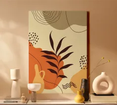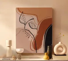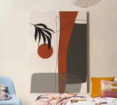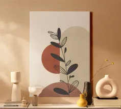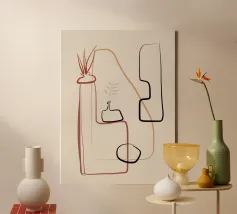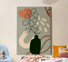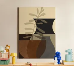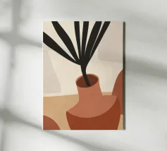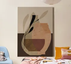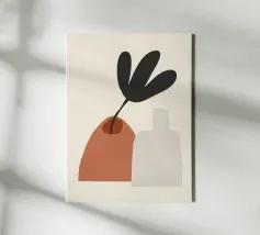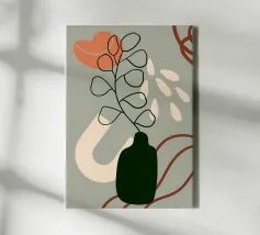 Abstrakte Linien und Blöcke in gedeckten Farben bilden eine moderne Komposition mit einer minimalistischen Ästhetik. Eine stilisierte Pflanzenform und eine einfache Vasenform fügen organische Elemente hinzu, die mit geometrischen Formen kontrastieren.