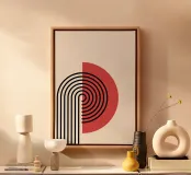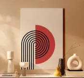 Mit diesem auffälligen abstrakten Kunstdruck verschmelzen Retro- und Modernismus-Ästhetik. Das Design zeigt einen kühnen roten Halbkreis, der einer komplexen Anordnung von schwarzen konzentrischen Bögen und parallelen Linien gegenübergestellt wird, wodurch eine visuell überzeugende und dynamische Komposition entsteht, die an das Grafikdesign der 70er Jahre erinnert. Dieses Stück verkörpert sowohl einen verspielten Retro-Charme als auch ein klares, modernes Gefühl. Mit einer beeindruckenden Auflösung von 7000x5000 Pixeln und einer Auflösung von 300 dpi stellt dieses hochwertige Digitalkunstwerk sicher, dass jede scharfe Linie und jeder leuchtende Farbton mit außergewöhnlicher Präzision wiedergegeben wird, was es zu einer überzeugenden Ergänzung für