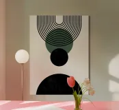 Dieses geometrische Design kombiniert klare schwarze Linien, die einen Halbkreis formen, mit überlagerten Kreisen in Grün und Schwarz. Der Kontrast zwischen den gedeckten Farben und dem hellen Hintergrund verleiht diesem Motiv eine moderne und harmonische Ästhetik. Perfekt für Wandbilder, Tassen, Kissen oder Handyhüllen, bringt es eine elegante und beruhigende Atmosphäre in jeden Raum. Ideal für Liebhaber minimalistischer und zeitloser Boho-Kunst sowie als inspirierende Geschenkidee.