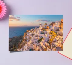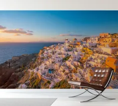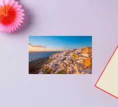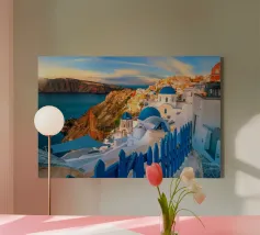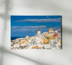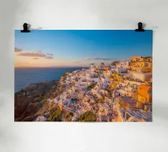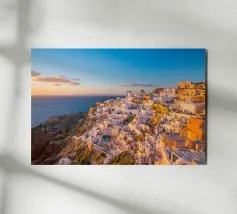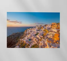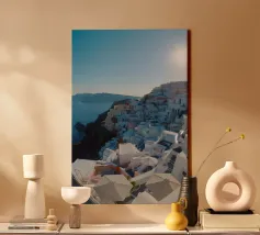 Ein sonnenbeschienener Weg führt an weißen Fassaden entlang, während Oia zur Caldera hinabsteigt. Dächer und Geländer führen den Blick über die Klippen, während sich die Ägäis zu einem ruhigen Horizont öffnet. Ein heller, luftiger Blick, der Architektur, Meer und Raum miteinander verbindet.