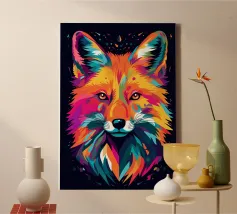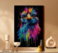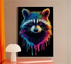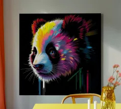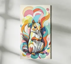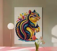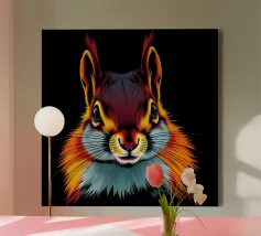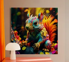 Ein farbenfrohes Eichhörnchen blickt mit großen, ausdrucksstarken Augen direkt in die Kamera. Die Illustration nutzt eine breite Palette leuchtender Farben – darunter Blau, Pink, Lila, Rot und Gelb –, die das Fell lebendig erscheinen lassen. Besonders auffällig ist der Farbverlauf, der sich von den Ohren bis zu den Pfoten zieht und in kräftigen Farbklecksen und Farbtropfen mündet. Der Hintergrund ist tiefschwarz, was die brillante Farbigkeit noch stärker hervorhebt und dem Motiv eine moderne, dynamische Ausstrahlung verleiht.