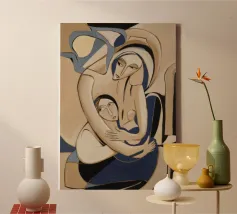 Dieses Kunstwerk präsentiert eine kontemplative und introspektive Komposition mit einer Mischung aus geometrischen und organischen Formen. Die Farbpalette umfasst Blau, Rot und Beige und schafft ein Gefühl von Ausgewogenheit und Harmonie. Die durchdachte Anordnung von Formen und Farben macht es zu einem fesselnden Werk.
