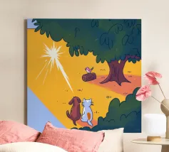 Dieses Kunstwerk zeigt eine mürrisch aussehende Wolke mit einer Gedankenblase, die einen Vogel und einen Bären enthält. Die humorvolle und fantasievolle Szene ist vor einem sanften blauen Hintergrund zu sehen.