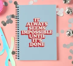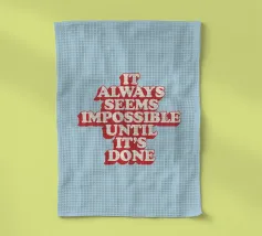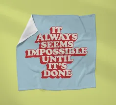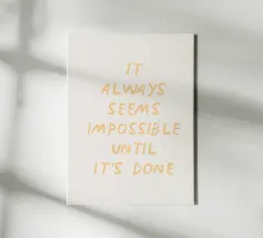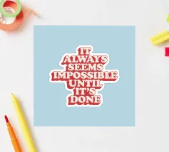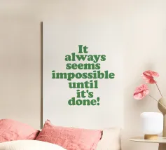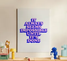 Dieser auffällige Kunstdruck mit dem Satz "It Always Seems Impossible Until It's Done" (Es scheint immer unmöglich zu sein, bis es geschafft ist) in fetten roten und weißen Retro-3D-Schriftzügen auf einem leuchtend himmelblauen Hintergrund erhellt jeden Raum. Das dynamische Design inspiriert zu Durchhaltevermögen und Positivität und ist damit ein perfektes Geschenk für Studenten, Heimbüros oder jeden, der Ermutigung braucht. Die auffälligen Farben und das Vintage-Flair passen sowohl zu modernen als auch zu klassischen Interieurs. Ideal für Geburtstage, Abschlussfeiern oder um die eigenen Wände mit einem täglichen Schub an Selbstvertrauen und Stil zu verschönern.
