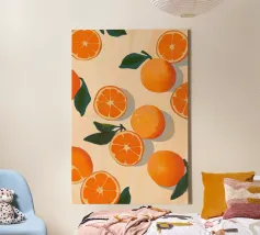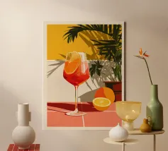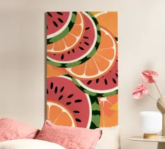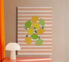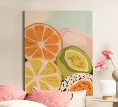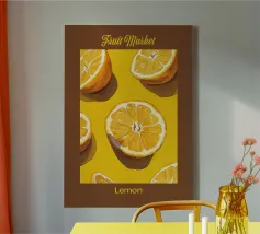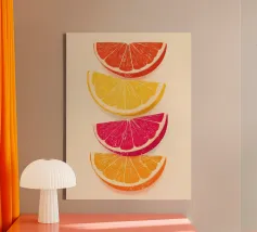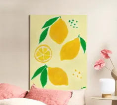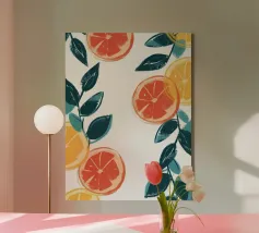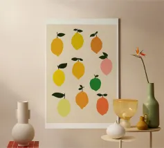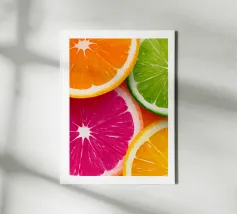 Ein kühnes und verspieltes digitales Kunstwerk mit stilisierten Zitronen- und Limettenscheiben, die in einem lebendigen, geometrischen Muster angeordnet sind. Mit knackigen Schatten und einer fühlbaren Papierstruktur verbindet dieses Design Bauhaus-Ästhetik mit mediterraner Frische. Perfekt für Küchendekorationen, Sommerdrucke oder moderne Wandkunst.