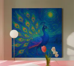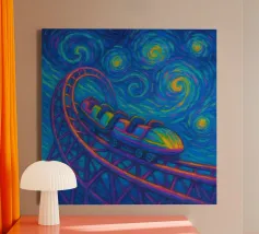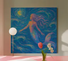 Dieses fesselnde Kunstwerk zeigt eine einsame Figur, die vor einem strahlenden, wirbelnden Strudel steht, in dem sich tiefe Blautöne mit lebhaftem goldenem Licht vermischen. Die strukturierten, malerischen Pinselstriche erzeugen ein faszinierendes Gefühl von Bewegung und Geheimnis und laden den Betrachter zu einer traumhaften Reise ein. Mit seinem atmosphärischen Glanz und seiner kontemplativen Stimmung spricht dieses Design Fans von surrealen Landschaften, symbolischer Kunst und emotionalen Geschichten an. Ein auffälliges Statement, das modernen Innenräumen, Kreativstudios oder Meditationsräumen Tiefe, Faszination und Farbe verleiht. Lassen Sie Ihre Wand eine Geschichte des Wunders erzählen.
