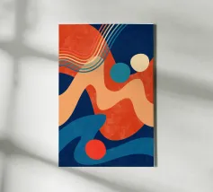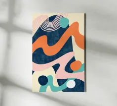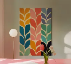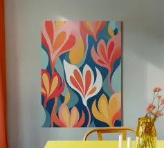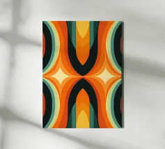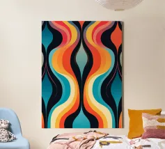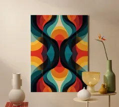 Dieses Kunstwerk ist eine faszinierende optische Illusion und eine Hommage an die Psychedelische Kunst und Op-Art der späten 1960er und frühen 70er Jahre. Geschwungene, fließende Formen in flammendem Rot und warmem Orange treffen auf kühle Töne von Türkis und Blaugrün, was eine dynamische, feurige und zugleich aquatische Spannung erzeugt. Die vertikale Symmetrie und die geschichteten, tropfenförmigen Motive erinnern an ikonische Stoff- und Tapetendesigns dieser Ära. Das Muster erzeugt einen unaufhörlichen visuellen Sog und scheint fast zu atmen. Ein energiegeladener, hypnotischer Blickfang.