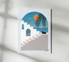 A charming illustration of a black cat sitting on the steps of a beautiful seaside town, with buildings rendered in soft pinks. The scene is peaceful, picturesque, and full of Mediterranean charm.